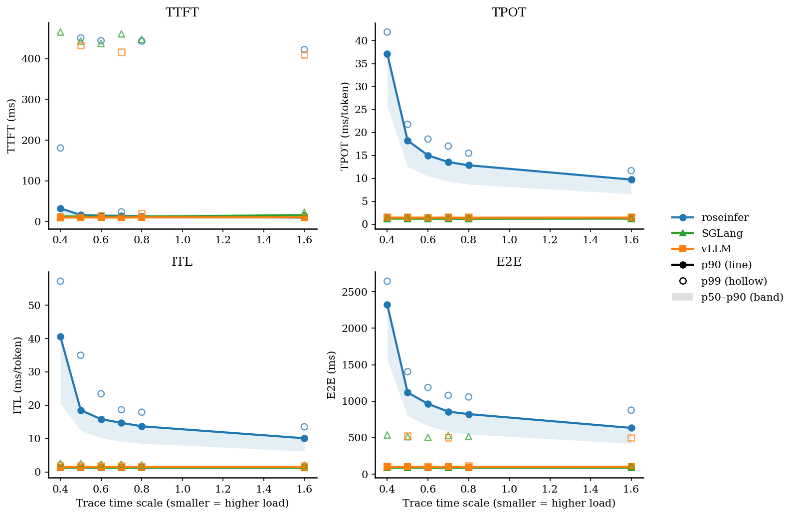 - 1 张 online latency 2x2 总览图(TTFT/TPOT/ITL/E2E),p90 曲线 + p50~p90 阴影带(空心点为 p99)