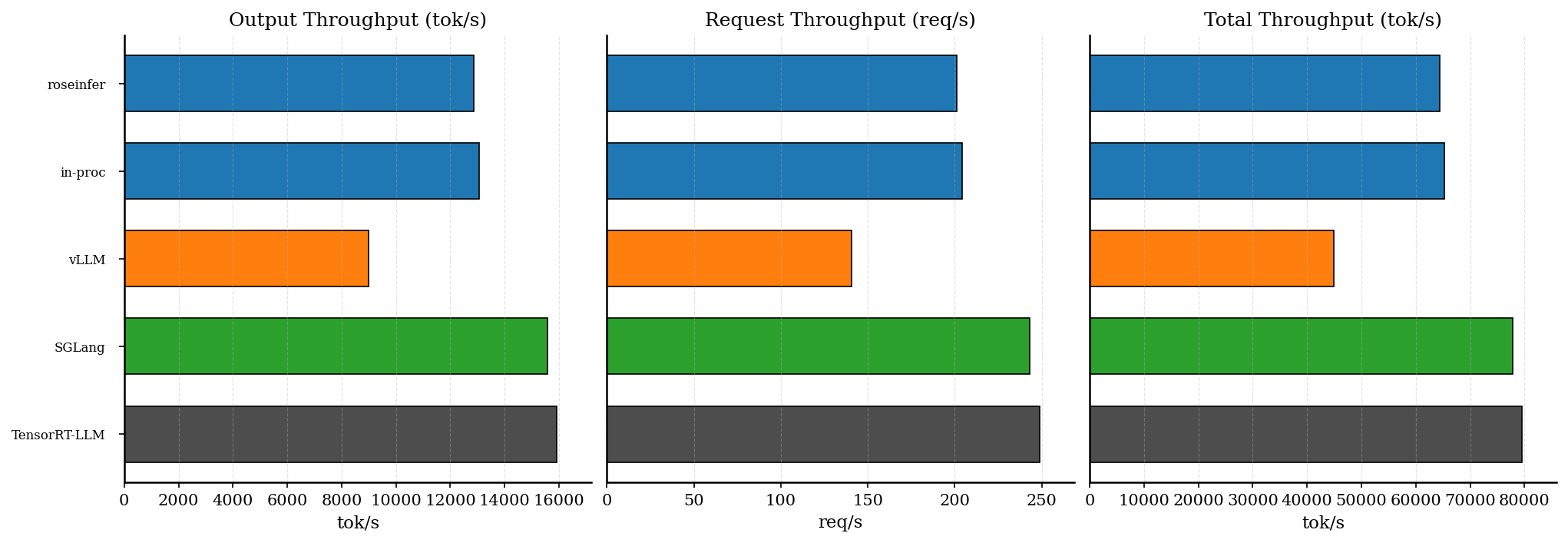 - model: `gpt2`, dtype: `fp16`, `num_prompts=128`, `input_len=256`, `output_len=64`, `ignore_eos=true` - versions: `git_rev=5099b2b, rosellm=0.1.0, vllm=0.7.2, sglang=0.4.6, torch=2.6.0, transformers=4.51.3, python=3.11.11` | backend | req/s | output tok/s | total tok/s | total latency (s) | |---|---:|---:|---:|---:| | roseinfer | 201.14 | 12872.99 | 64364.95 | 0.636 | | roseinfer (in-proc) | 204.01 | 13056.84 | 65284.22 | 0.627 | | SGLang | 243.20 | 15564.48 | 77822.40 | 0.526 | | TensorRT-LLM | 248.69 | 15916.24 | 79581.21 | 0.515 | | vLLM | 140.44 | 8988.14 | 44940.70 | 0.911 |offline 也很清晰: