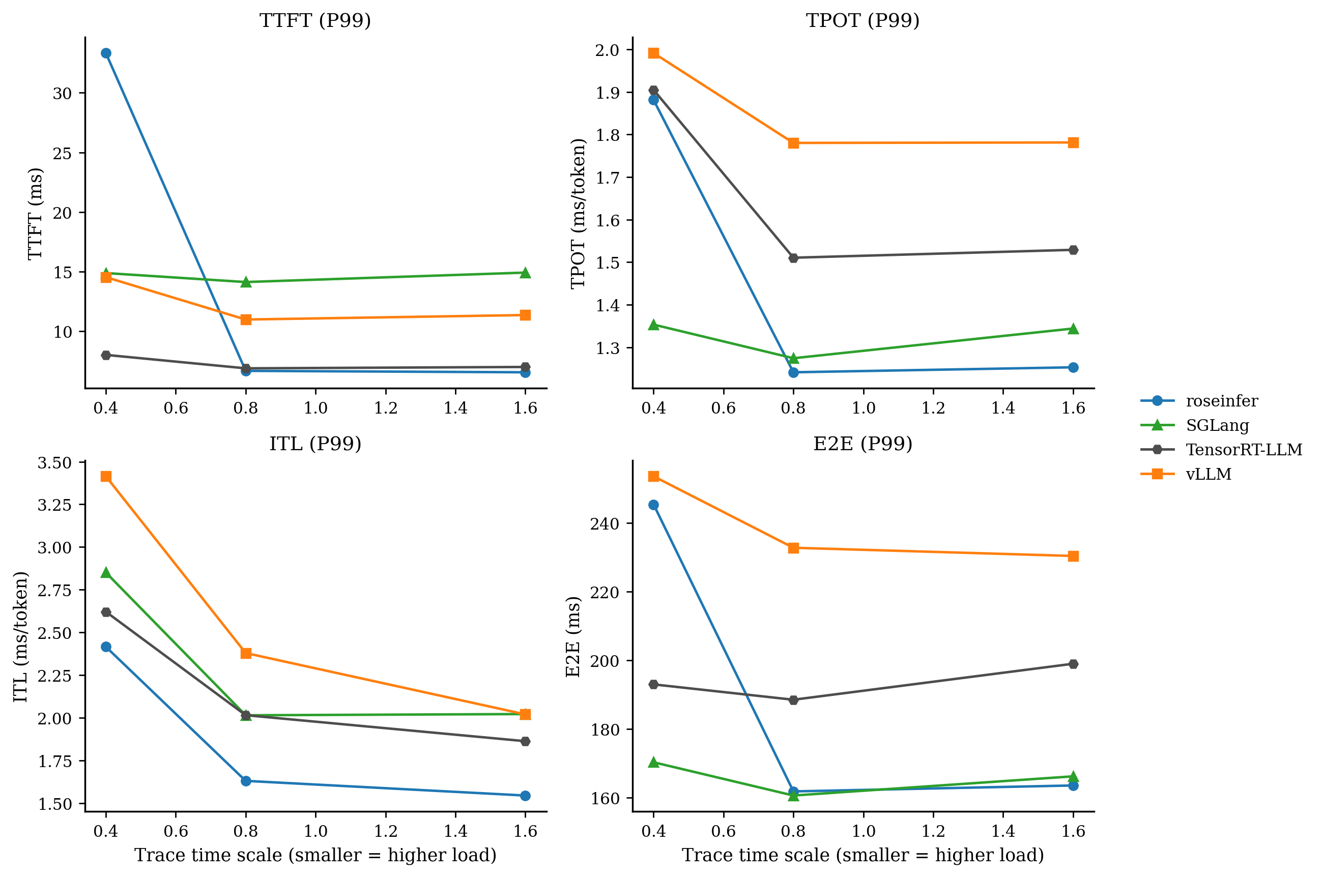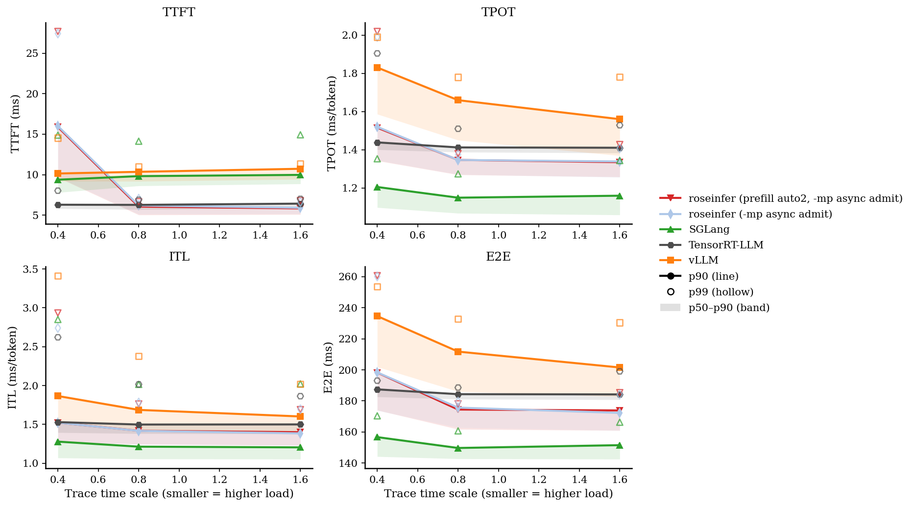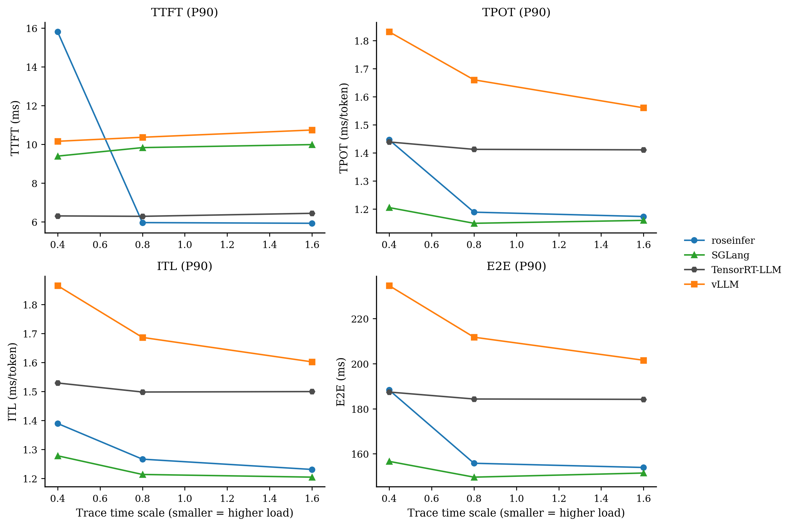 - model: `gpt2`, dtype: `fp16`, `n=200`, scales: `[0.4, 0.8, 1.6]` - versions: `git_rev=0cd08cb, rosellm=0.1.0, vllm=0.7.2, sglang=0.4.6, tensorrt_llm=1.1.0, torch=2.6.0, transformers=4.51.3, python=3.11.11` | scale | backend | TTFT p50/p90/p99 (ms) | TPOT p50/p90/p99 (ms) | ITL p50/p90/p99 (ms) | E2E p50/p90/p99 (ms) | |---:|---|---:|---:|---:|---:| | 0.40 | roseinfer | 9.48/15.80/33.33 | 1.19/1.45/1.88 | 1.13/1.39/2.42 | 154.50/188.30/245.44 | | 0.40 | SGLang | 7.80/9.39/14.89 | 1.10/1.21/1.35 | 1.07/1.28/2.85 | 144.13/156.65/170.35 | | 0.40 | TensorRT-LLM | 5.82/6.30/8.03 | 1.40/1.44/1.90 | 1.40/1.53/2.62 | 182.62/187.42/193.03 | | 0.40 | vLLM | 9.20/10.15/14.54 | 1.59/1.83/1.99 | 1.53/1.87/3.41 | 201.93/234.64/253.63 | | 0.80 | roseinfer | 5.24/5.96/6.69 | 1.12/1.19/1.24 | 1.10/1.27/1.63 | 145.27/155.80/161.87 | | 0.80 | SGLang | 8.63/9.83/14.13 | 1.07/1.15/1.27 | 1.06/1.21/2.02 | 142.70/149.64/160.67 | | 0.80 | TensorRT-LLM | 5.71/6.28/6.90 | 1.39/1.41/1.51 | 1.38/1.50/2.02 | 181.14/184.33/188.56 | | 0.80 | vLLM | 9.19/10.36/10.99 | 1.45/1.66/1.78 | 1.42/1.69/2.38 | 186.06/211.76/232.81 | | 1.60 | roseinfer | 5.38/5.92/6.57 | 1.11/1.17/1.25 | 1.09/1.23/1.55 | 144.00/153.93/163.60 | | 1.60 | SGLang | 8.87/9.98/14.93 | 1.06/1.16/1.34 | 1.05/1.20/2.02 | 142.46/151.47/166.25 | | 1.60 | TensorRT-LLM | 5.88/6.43/7.02 | 1.38/1.41/1.53 | 1.38/1.50/1.86 | 180.76/184.17/199.04 | | 1.60 | vLLM | 9.44/10.73/11.37 | 1.37/1.56/1.78 | 1.38/1.60/2.02 | 182.80/201.53/230.43 |这张表里我看到三个很明确的信号: