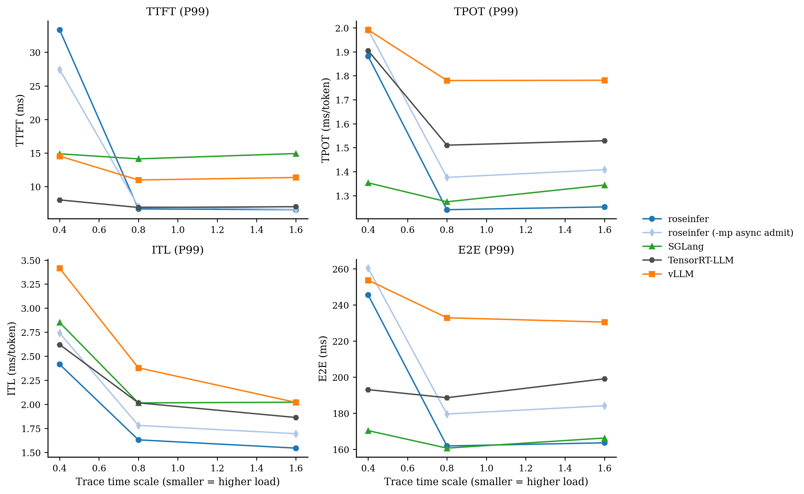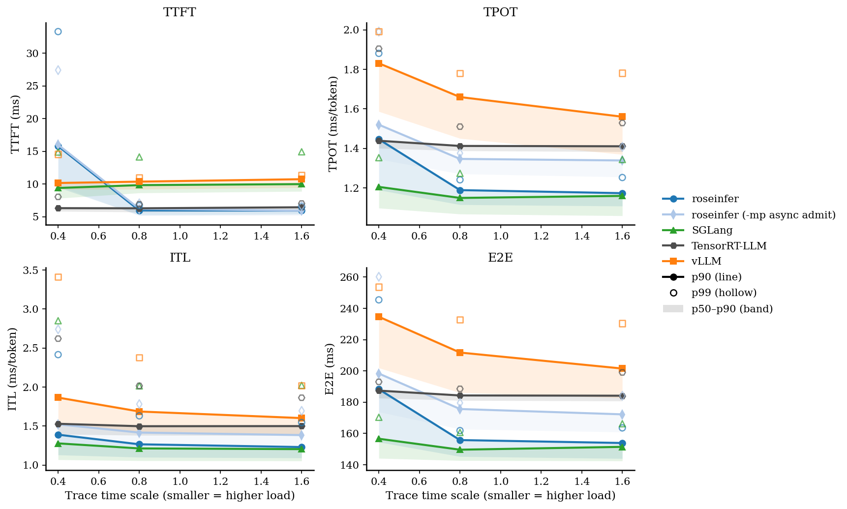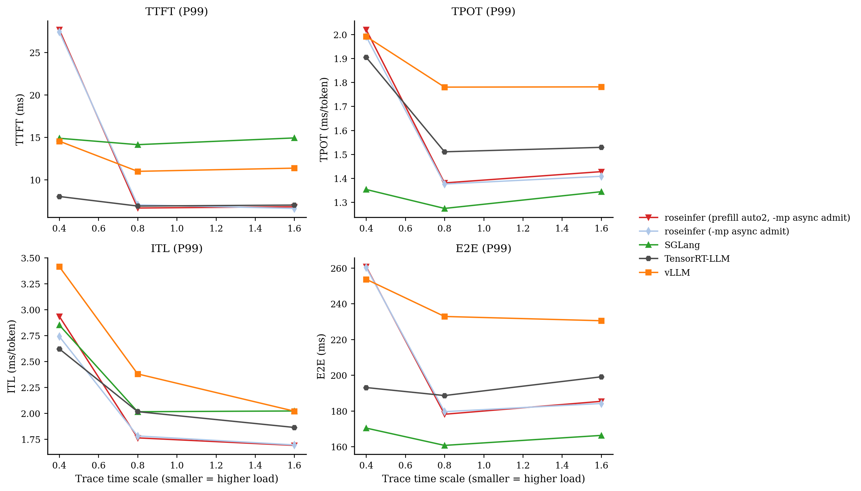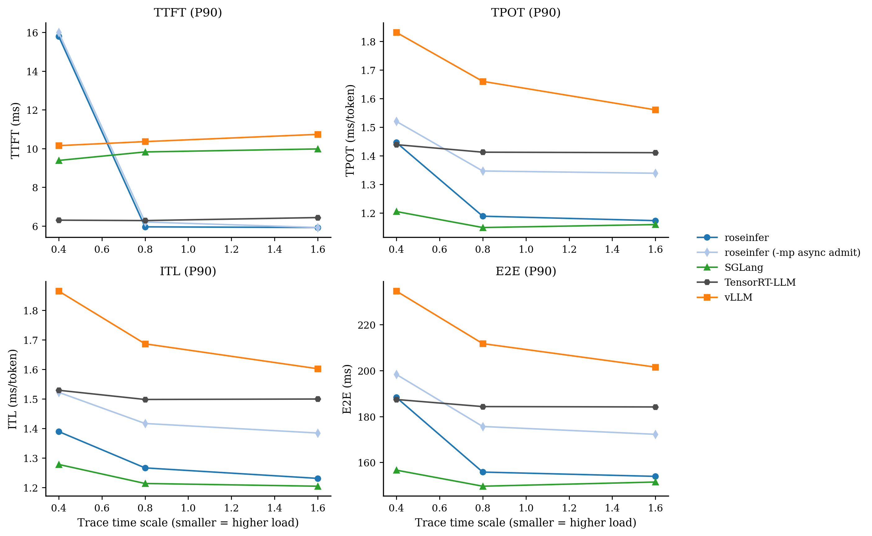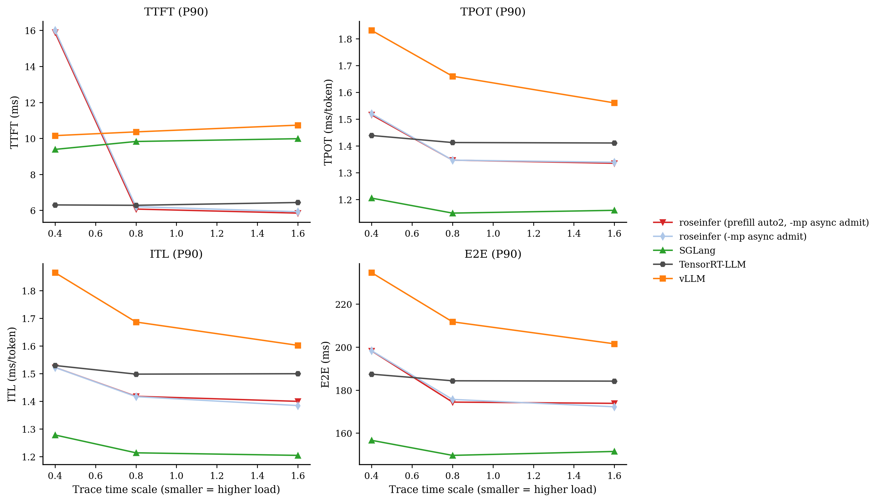 - model: `gpt2`, dtype: `fp16`, `n=200`, scales: `[0.4, 0.8, 1.6]` - versions: `git_rev=0cd08cb, rosellm=0.1.0, vllm=0.7.2, sglang=0.4.6, tensorrt_llm=1.1.0, torch=2.6.0, transformers=4.51.3, python=3.11.11` | scale | backend | TTFT p50/p90/p99 (ms) | TPOT p50/p90/p99 (ms) | ITL p50/p90/p99 (ms) | E2E p50/p90/p99 (ms) | |---:|---|---:|---:|---:|---:| | 0.40 | roseinfer | 9.48/15.80/33.33 | 1.19/1.45/1.88 | 1.13/1.39/2.42 | 154.50/188.30/245.44 | | 0.40 | roseinfer (-mp async admit) | 9.75/16.00/27.43 | 1.35/1.52/1.99 | 1.28/1.52/2.74 | 173.78/198.34/260.21 | | 0.40 | SGLang | 7.80/9.39/14.89 | 1.10/1.21/1.35 | 1.07/1.28/2.85 | 144.13/156.65/170.35 | | 0.40 | TensorRT-LLM | 5.82/6.30/8.03 | 1.40/1.44/1.90 | 1.40/1.53/2.62 | 182.62/187.42/193.03 | | 0.40 | vLLM | 9.20/10.15/14.54 | 1.59/1.83/1.99 | 1.53/1.87/3.41 | 201.93/234.64/253.63 | | 0.80 | roseinfer | 5.24/5.96/6.69 | 1.12/1.19/1.24 | 1.10/1.27/1.63 | 145.27/155.80/161.87 | | 0.80 | roseinfer (-mp async admit) | 5.14/6.20/7.04 | 1.27/1.35/1.38 | 1.24/1.42/1.78 | 162.81/175.66/179.54 | | 0.80 | SGLang | 8.63/9.83/14.13 | 1.07/1.15/1.27 | 1.06/1.21/2.02 | 142.70/149.64/160.67 | | 0.80 | TensorRT-LLM | 5.71/6.28/6.90 | 1.39/1.41/1.51 | 1.38/1.50/2.02 | 181.14/184.33/188.56 | | 0.80 | vLLM | 9.19/10.36/10.99 | 1.45/1.66/1.78 | 1.42/1.69/2.38 | 186.06/211.76/232.81 | | 1.60 | roseinfer | 5.38/5.92/6.57 | 1.11/1.17/1.25 | 1.09/1.23/1.55 | 144.00/153.93/163.60 | | 1.60 | roseinfer (-mp async admit) | 5.18/5.92/6.62 | 1.26/1.34/1.41 | 1.23/1.38/1.70 | 160.91/172.25/184.12 | | 1.60 | SGLang | 8.87/9.98/14.93 | 1.06/1.16/1.34 | 1.05/1.20/2.02 | 142.46/151.47/166.25 | | 1.60 | TensorRT-LLM | 5.88/6.43/7.02 | 1.38/1.41/1.53 | 1.38/1.50/1.86 | 180.76/184.17/199.04 | | 1.60 | vLLM | 9.44/10.73/11.37 | 1.37/1.56/1.78 | 1.38/1.60/2.02 | 182.80/201.53/230.43 |这组数据的结论非常“拧巴”: