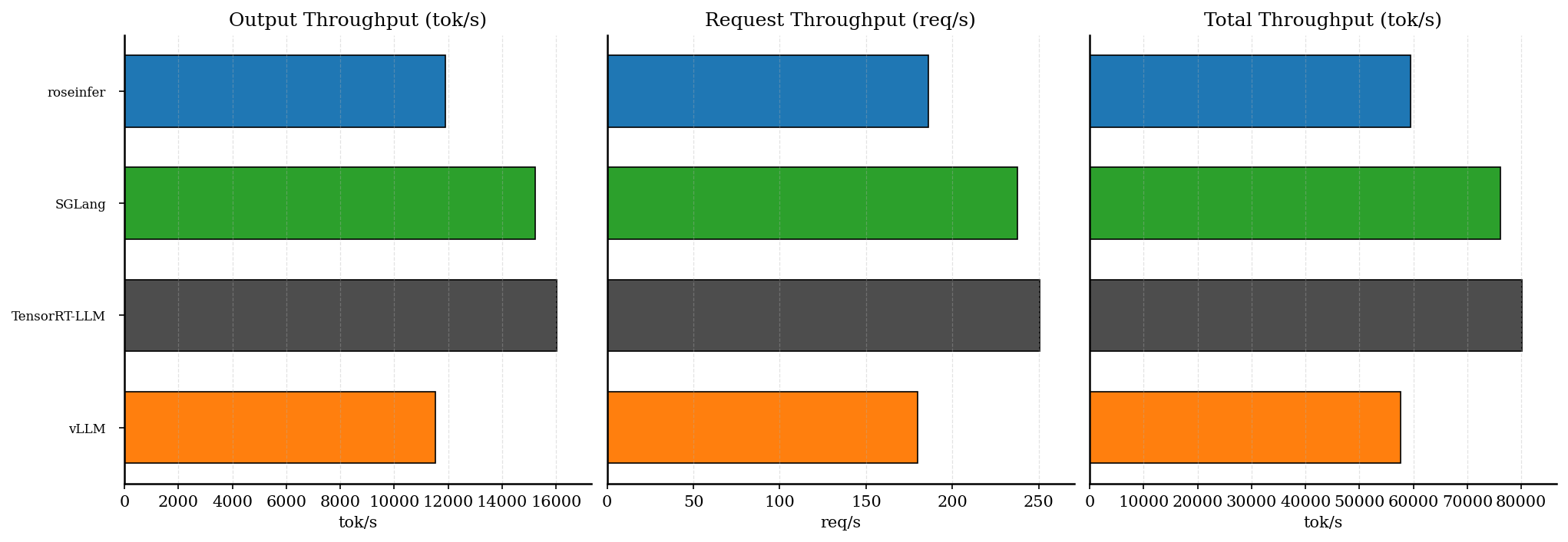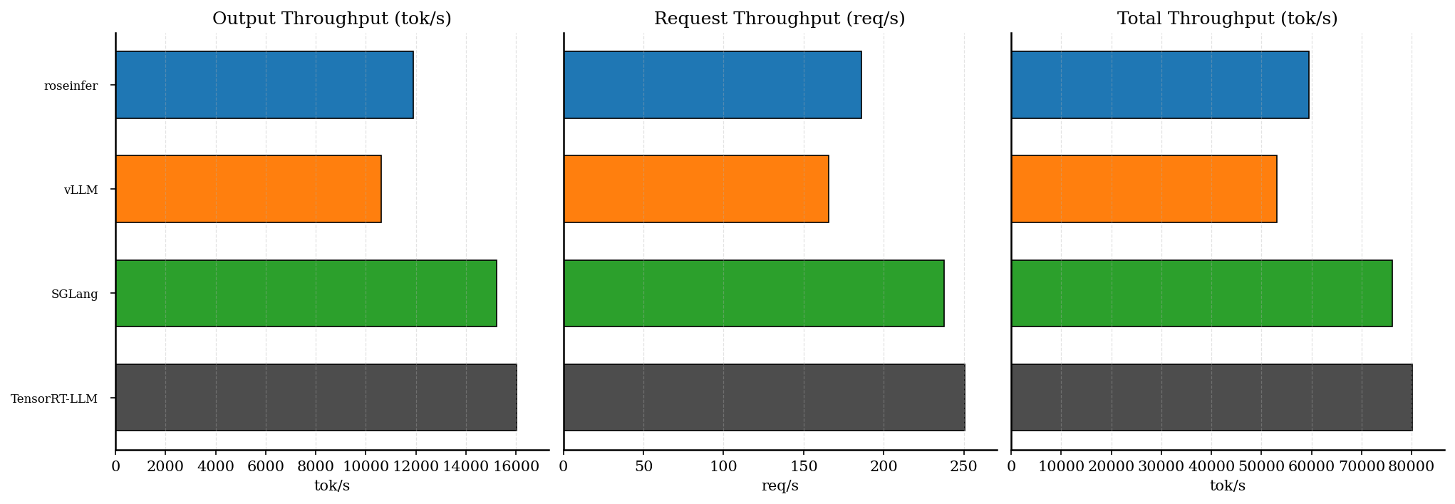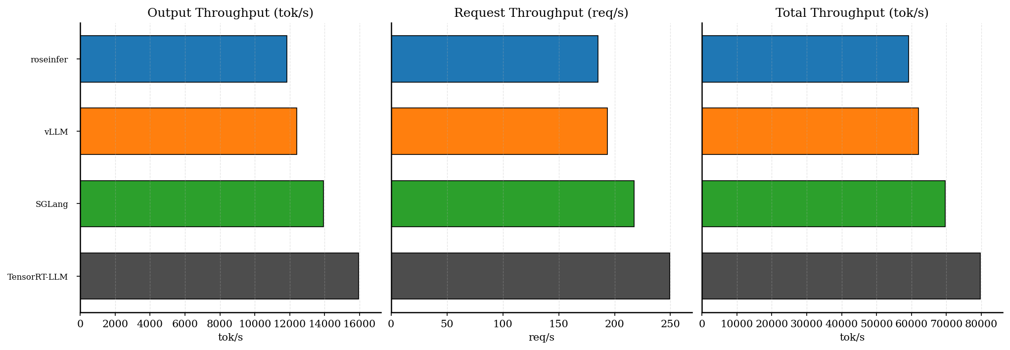 这篇文章直接用仓库自带的 serving benchmark 跑一轮 baseline,对比 roseinfer / vLLM / SGLang / TensorRT-LLM: